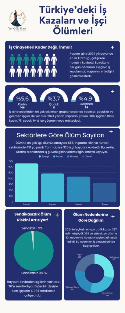İşçi Sağlığı ve İş Güvenliği (İSİG) Meclisi’nin 2024 yılıyla ilgili olarak yayımladığı rapor, Türkiye’deki işçilerin çalışma şartlarının ne kadar tehlikeli olduğunu bir kez daha gözler önüne sermiştir. Rapora göre 2024 yılı boyunca en az 1.897 işçi, çalışırken hayatını kaybetti. Bu rakam, her gün ortalama beş işçinin iş kazalarında yaşamını yitirdiğini göstermektedir. Uzmanlar, bu ölümlerin büyük